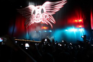 O Aerosmith subiu ao palco por volta das 21h40. Antes de a banda iniciar o show, as luzes se apagaram e uma enorme bandeira (ou seria uma cortina?) com o logo do grupo ficou entre a boca do palco e o público, ao som de “Rainy Day Women #12 & 35”, de Bob Dylan. Nada por acaso, já que o refrão da música tinha tudo a ver com a carreira “chapada” do grupo de Tyler e Cia.