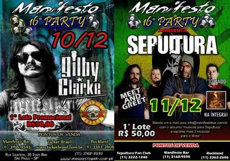 Tradicionalíssimo reduto roqueiro na capital paulista, o Manifesto Bar comemorará seu aniversário de 16 anos em alto estilo entre hoje (10) e amanhã (11). Nesta sexta-feira, o bar que está localizado no Itaim Bibi vai receber o show do guitarrista norte-americano Gilby Clarke, que já tocou no Guns N’ Roses e no Slash’s Snakepit na década de 90. No sábado, é a vez do orgulho nacional Sepultura apresentar no palco do bar o mais do que clássico álbum “Arise”, de 1991, na íntegra.