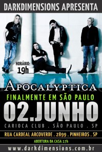 Agora parece que é para valer! O Apocalyptica confirmou que voltará ao Brasil. De acordo com a produtora Dark Dimensions, o grupo finlandês fará show em São Paulo, no Carioca Club, no dia 2 de junho. A banda também anunciou, por meio do Facebook, que se apresentará no dia seguinte no Bar Opinião, em Porto Alegre***.
