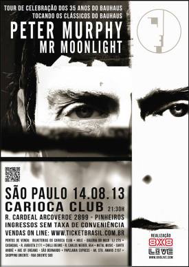 Já estão à venda os ingressos para o show único que Peter Murphy, ex-vocalista do já extinto Bauhaus, fará em São Paulo no dia 14 de agosto. A apresentação, que acontecerá no Carioca Club, celebrará os 35 anos do grupo britânico com a “Mr. Moonlight Tour”, na qual só canta clássicos do repertório dos reis do rock gótico.