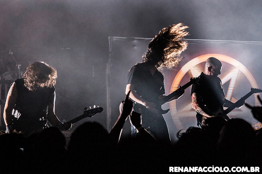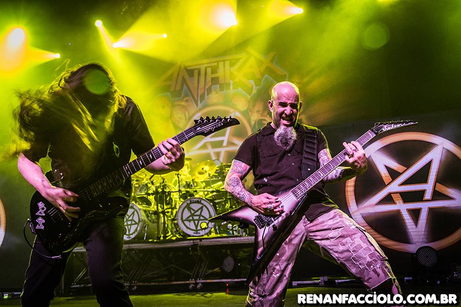 Terminada a competente apresentação do Testament, a equipe de roadies fez um trabalho relativamente rápido e deixou o palco completamente pronto para o Anthrax iniciar sua festa. Já com o HSBC claramente mais cheio que no show anterior, o grupo iniciou sua celebração do thrash metal com três petardos sonoros históricos do gênero.