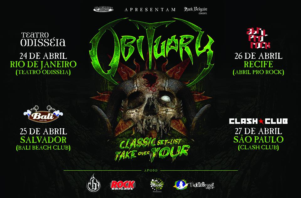 Lendária banda do death metal, o Obituary volta ao Brasil neste fim de abril para shows em quatro cidades. O grupo norte-americano se apresentará no dia 24, no Rio de Janeiro (Teatro Odisseia); no dia 25, em Salvador (Bali Beach Club); no dia 26, em Olinda, no festival Abril Pro Rock; e no dia 27, em São Paulo, no Clash Club.