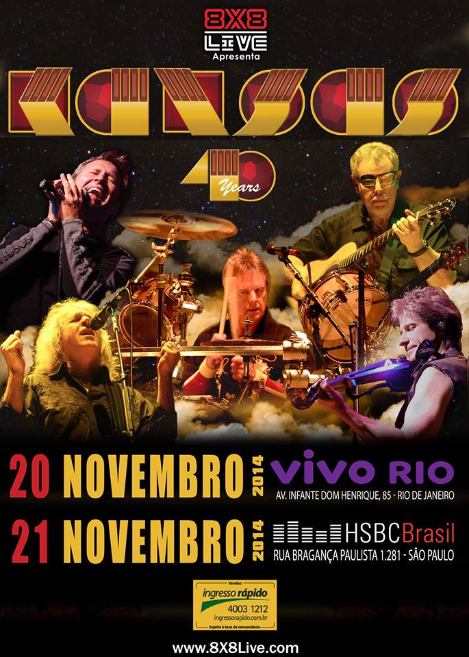 A veterana banda Kansas volta ao Brasil em novembro para shows no Rio de Janeiro e em São Paulo. Com o tema de comemoração de mais de 4o anos de carreira, o grupo norte-americano tocará no dia 20 de novembro no Vivo Rio e no dia seguinte no HSBC Brasil, na capital paulista.