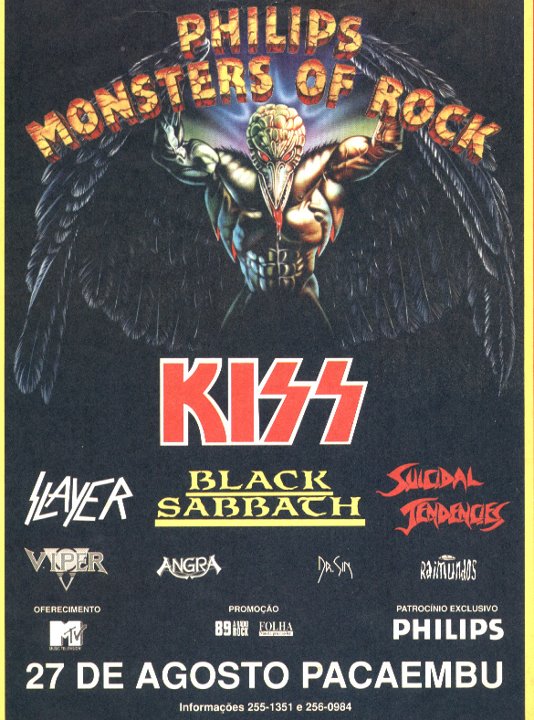 Entre os grupos gringos, a lista trazia o Suicidal Tendencies com sua formação clássica; o Black Sabbath sem Ozzy Osbourne ou Ronnie James Dio nos vocais, mas com o terrível Tony Martin; o aguardadíssimo Slayer pela primeira vez no Brasil, mas sem Dave Lombardo na bateria; e o não menos esperado KISS, sem máscara, fechando o festival.