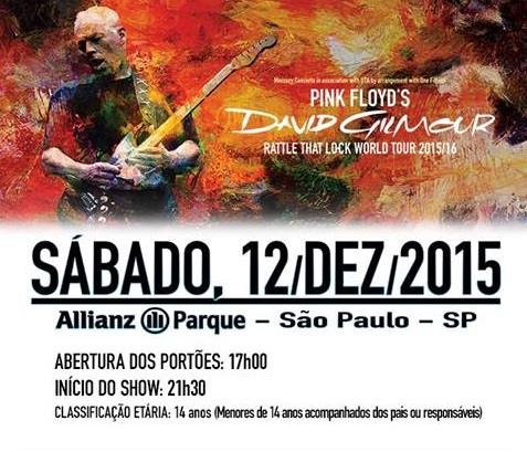 David Gilmour, que lançará álbum novo ainda em setembro, vai se apresentar em três capitais brasileiras. Em São Paulo, no dia 12 de dezembro, na arena alviverde. Em Curitiba, tocará no dia 14 na Pedreira Paulo Leminski. Em Porto Alegre, fará show no dia 16 na Arena Grêmio.