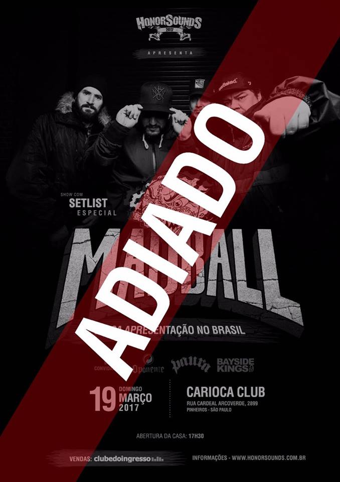 O Madball iria participar da 14ª edição do projeto HonorSounds. Segundo os organizadores do show único em São Paulo no Carioca Club, todos os ingressos adquiridos para a apresentação do dia 19 de março estarão valendo para a nova data que, segundo eles, será divulgada o mais breve possível.