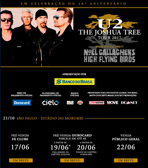 O que era amplamente previsto aconteceu: os ingressos para o show do dia 19 de outubro do U2, em São Paulo, pela turnê comemorativa de 30 anos do clássico álbum “The Joshua Tree” se esgotaram rapidamente. Com isso, os produtores confirmaram uma apresentação extra. Ela será no mesmo Estádio do Morumbi, só que no dia 21 de outubro, um sábado.