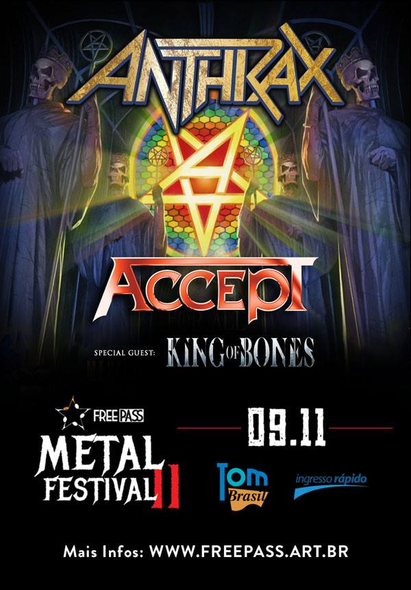 A Free Pass Entretenimento divulgou nesta quinta-feira, 17, os preços dos ingressos das passagens do Anthrax e do Accept pelo Brasil em novembro. As duas bandas tocarão em São Paulo no dia 9 de novembro no Tom Brasil, tendo como convidado especial de abertura o grupo King of Bones.