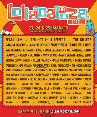 Os organizadores do Lollapalooza anunciaram no dia 27 de setembro a lista completa de atrações para a edição de 2018 em São Paulo. Pearl Jam, Red Hot Chili Peppers, The Killers, Imagine Dragons, Lana Del Rey e LCD Soundsystem são os headliners.