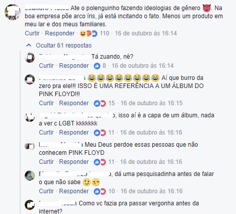 “Ate o polenguinho fazendo ideologias de gênero 👿. Na boa empresa põe arco íris, já está incitando o fato. Menos um produto em meu lar e dos meus familiares”, escreveu um sujeito, que foi criticado e ridicularizado por diversos usuários do Facebook.