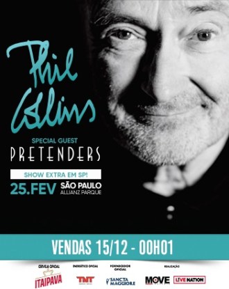 Phil Collins fará show extra em São Paulo em 2018. Em virtude da grande procura por ingressos para a apresentação que o ex-integrante do Genesis fará no dia 24 de fevereiro na Arena do Palmeiras, os organizadores anunciaram na quarta-feira, 13 de dezembro, uma outra data, a do dia 25 de fevereiro do próximo ano, no mesmo Allianz Parque, como opção aos fãs.