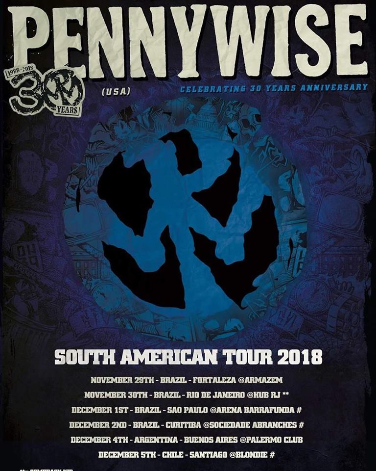 O Pennywise voltará ao Brasil no último bimestre de 2018 para shows em quatro capitais brasileiras. A banda norte-americana de punk rock/hardcore vai trazer a turnê de 30 anos para Fortaleza, Rio de Janeiro, São Paulo e Curitiba.