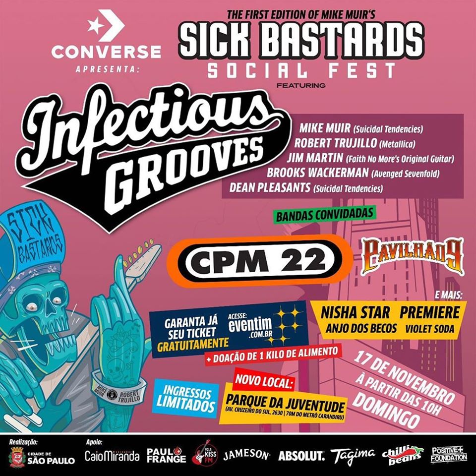 O Infectious Grooves será o headliner do 1ª Sick Bastard Social Fest. O festival, que anteriormente seria realizado no dia 17 de novembro, no Espaço das Américas, acontecerá na mesma data, mas no Parque da Juventude.