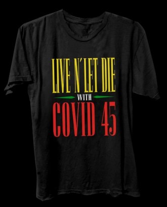 Na camiseta, cuja foto acompanha este texto, o Guns traz mais precisamente a frase “Live N’ Let Die with Covid 45”.