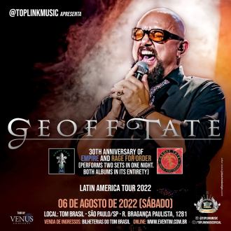 O cantor Geoff Tate voltará ao Brasil no segundo semestre do ano que vem para dois shows. O ex-vocalista do Queensrÿche vai se apresentar em São Paulo e no Rio de Janeiro em agosto de 2022.