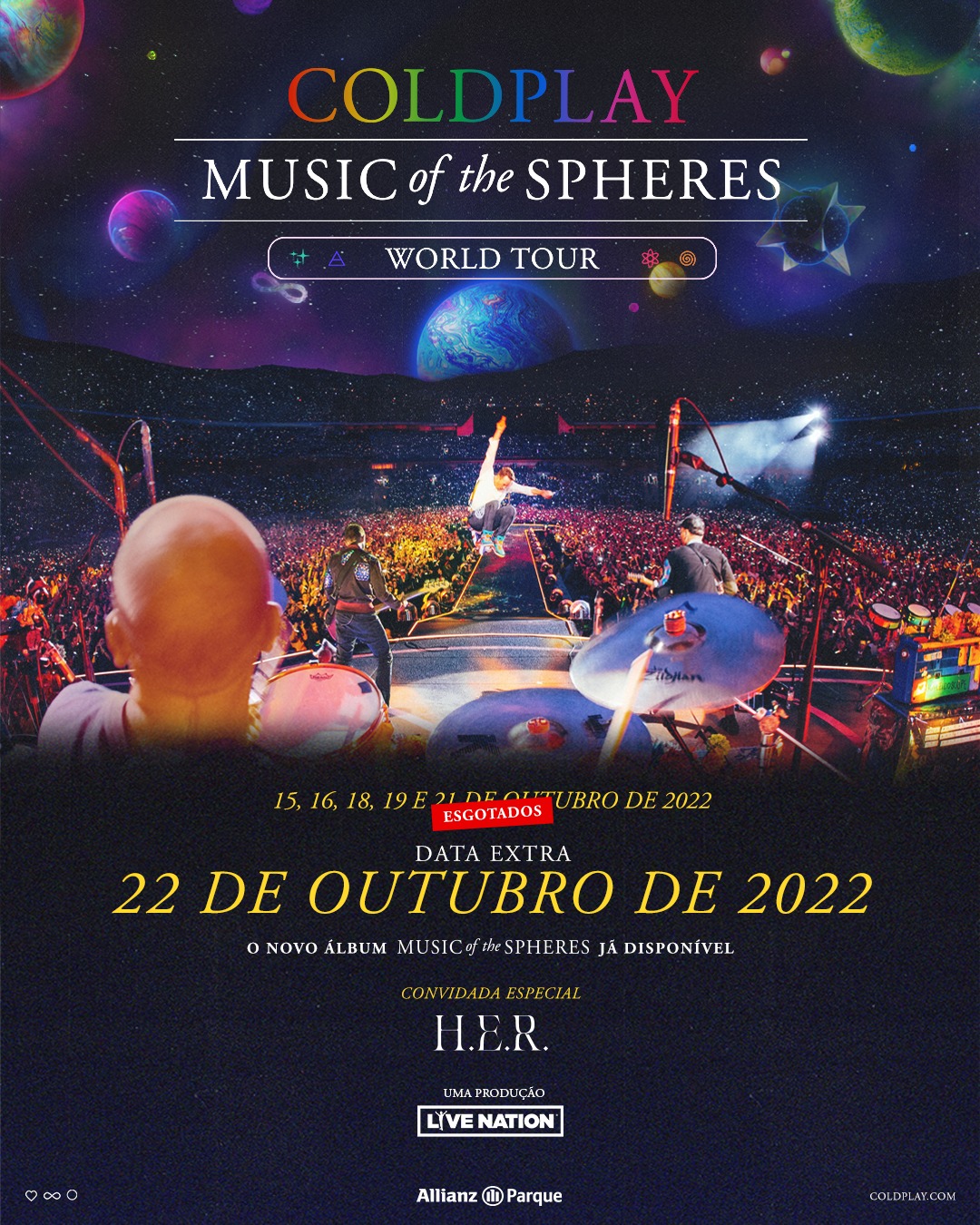 O Coldplay anunciou na quarta-feira, 1º de junho, o sexto show em São Paulo, no Allianz Parque, para o mês de outubro. O grupo britânico tocará agora também no dia 22 de outubro, renovando um recorde de apresentações na Arena do Palmeiras, inaugurada em 2014.
