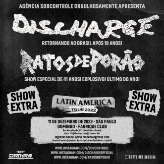 A veterana banda britânica Discharge anunciou um show extra em São Paulo. A apresentação será realizada no dia 11 de dezembro, um dia após o primeiro show, marcado para 10 de dezembro na capital paulista e que teve alta procura de ingressos.