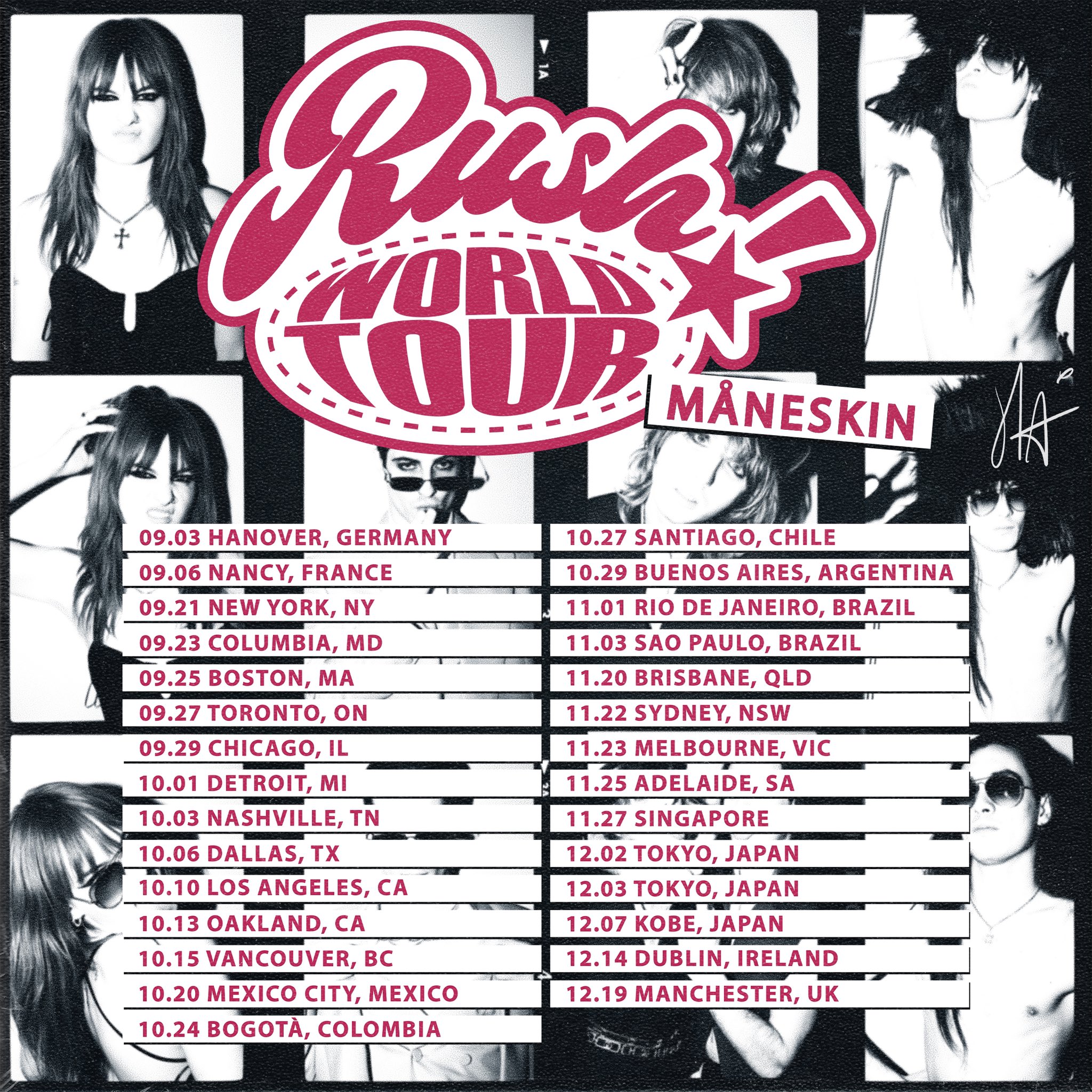 Antes dos shows no Brasil, o Måneskin tocará em outras cidades da América do Sul, como Bogotá, na Colômbia, no dia 24 de outubro; Santiago, no Chile, no dia 27 de outubro; e, em Buenos Aires, na Argentina, no dia 29.