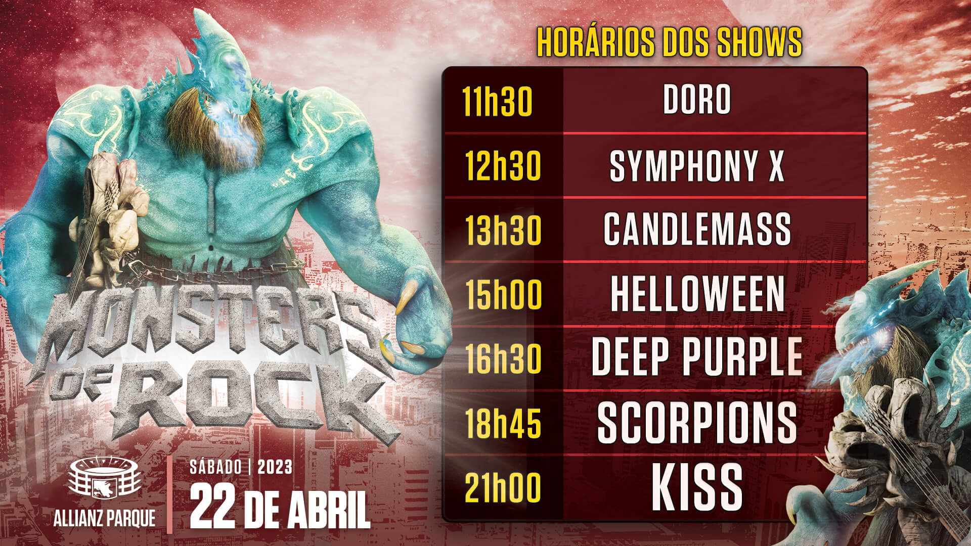A organização do Monsters of Rock divulgou os horários do festival de 2023 que acontecerá no sábado, dia 22 de abril, em São Paulo. O evento será realizado no Allianz Parque e reunirá o headliner KISS, além de Scorpions, Deep Purple, Helloween, Candlemass, Symphony X e a cantora Doro.