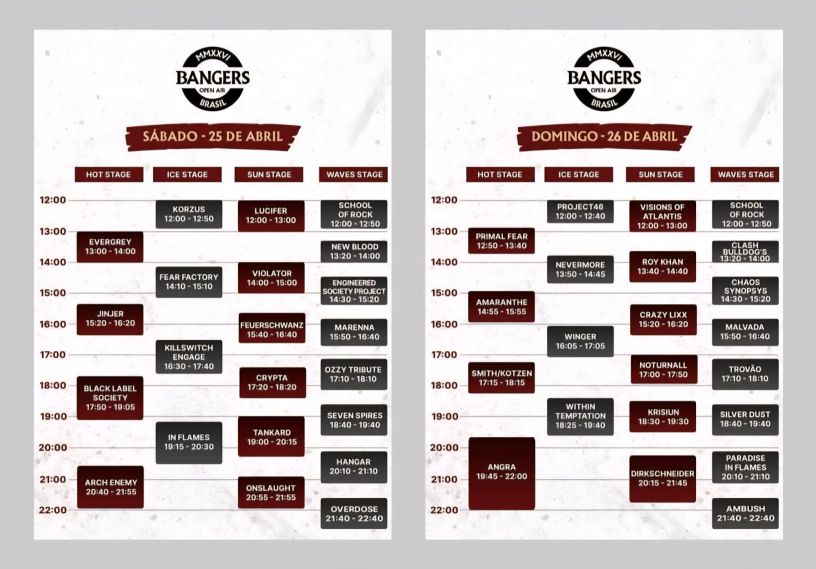 A organização do Bangers Open Air divulgou nesta quarta-feira, 18 de fevereiro, a grade de horários do festival que será realizado no fim de abril na cidade de São Paulo. A grade, que pode ser conferida na foto que acompanha este texto, já conta com as recentes atualizações no line-up, que trouxe a inclusão das bandas Arch Enemy, Krisiun e Ambush nos lugares de Twisted Sister, Cobra Spell e Eluveitie, respectivamente.