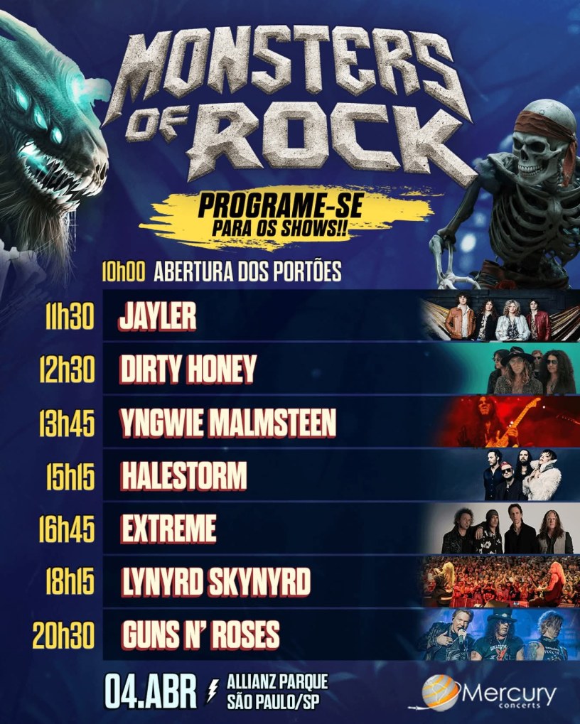 O festival Monsters of Rock Brasil já tem definidos os horários da edição que acontecerá no primeiro semestre de 2026 em São Paulo. Nesta sexta-feira, 13 de março, os organizadores do evento divulgaram a grade com toda a programação do evento que acontecerá no dia 4 de abril no Allianz Parque, a Arena do Palmeiras.