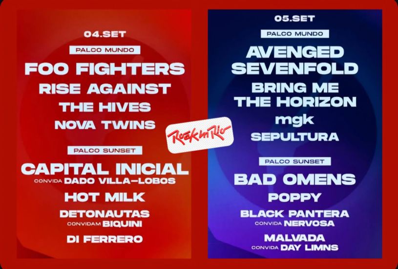 Os organizadores do Rock in Rio anunciaram nesta terça-feira, 17 de março, o complemento do line-up de dois dias (4 e 5 de setembro) dedicados ao rock no festival que será realizado na capital fluminense no segundo semestre de 2026. Entre as atrações confirmadas, destaques para o Sepultura, The Hives, Machine Gun Kelly e Rise Against, todos escalados para o Palco Mundo em dias distintos do evento.