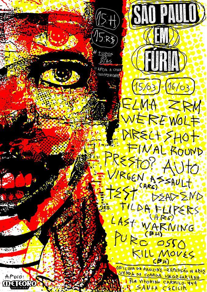 11-3-2014 -> A segunda edição do Festival São Paulo em Fúria será realizada nos dias 15 e 16 de março na capital paulista. O evento, que promete mesclar música, arte e tudo que existe de mais obscuro no underground nacional, acontecerá na Associação Cecília, localizada na Rua Vitorino Carmilo, 449, no bairro de Santa Cecília. Na lista de bandas, o dia 15 terá os shows do Elma, do Last Warning, do Direct Shot, do Kill Moves, do Presto?, do Dead End e da banda argentina Virgen Assault. O dia 16 terá shows dos grupos Werewolf, Auto, Tilda Flipers, Puro Osso, Final Round, Zero Real Marginal e Test. Além da música, haverá uma exposição coletiva com vários artistas independentes; banquinhas para vendas e trocas de gravuras, fanzines, publicações independentes e discos; e uma oficina de fanzine. Os shows começam a partir das 15 horas e os ingressos custam R$ 15,00 por dia. RЯ