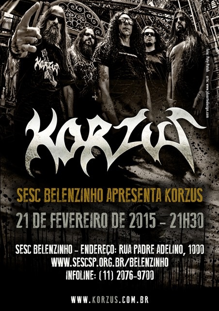 18-2-2015 -> A veterana banda Korzus se apresentará no sábado, dia 21 de fevereiro, no Sesc Belenzinho, na capital paulista. O grupo de thrash metal dá sequência à turnê de lançamento de seu mais recente álbum, “Legion”, de 2014. Marcello Pompeu (vocal), Heros Trench (guitarra), Dick Siebert (baixo), Antônio Araújo (guitarra) e Rodrigo Oliveira (bateria) devem subir ao palco às 21h30. Os ingressos para esta performance na capital paulista já estão à venda pelo site do Sesc e nas unidades da instituição espalhadas pela cidade. O valor da entrada inteira é de R$ 25,00. Aposentado, pessoa com mais de 60 anos, pessoa com deficiência, estudante e servidor da escola pública com comprovante pagam R$ 12,50. Trabalhador do comércio de bens, serviços e turismo credenciado no Sesc e dependentes pagam R$ 7,50. No repertório, além das novas composições, os músicos devem executar as já conhecidas “Correria”, “Mass Illusion”, “Discipline of Hate”, “Never Die”, “Guilty Silence”, “Ties of Blood”, “Raise Your Soul”, “Truth”, “I Am your God”, “What Are You Looking For”. RЯ