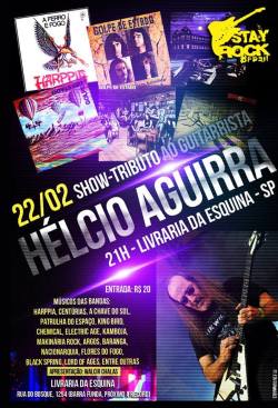 20-2-2014 -> Praticamente um mês depois da morte do guitarrista Hélcio Aguirra, da banda brasileira Golpe de Estado, será realizado um show-tributo em homenagem ao músico na cidade de São Paulo. O evento acontecerá no sábado, dia 22 de fevereiro, na Livraria da Esquina, localizada na Rua do Bosque, 1254, no bairro da Barra Funda. Com apresentação do grande Walcir Chalas, dono da Woodstock Discos, músicos de bandas brasileiras novas e antigas tocarão canções dos diversos grupos que contaram com Aguirra, com o próprio Golpe de Estado e o Harppia. Só para ter uma ideia de quem vai participar, haverá representantes dos grupos Centúrias, A Chave do Sol, Patrulha do Espaço, Baranga, Chemical, Harppia e Makinária Rock, entre outras bandas. O ingresso para o evento custa R$ 20,00. RЯ